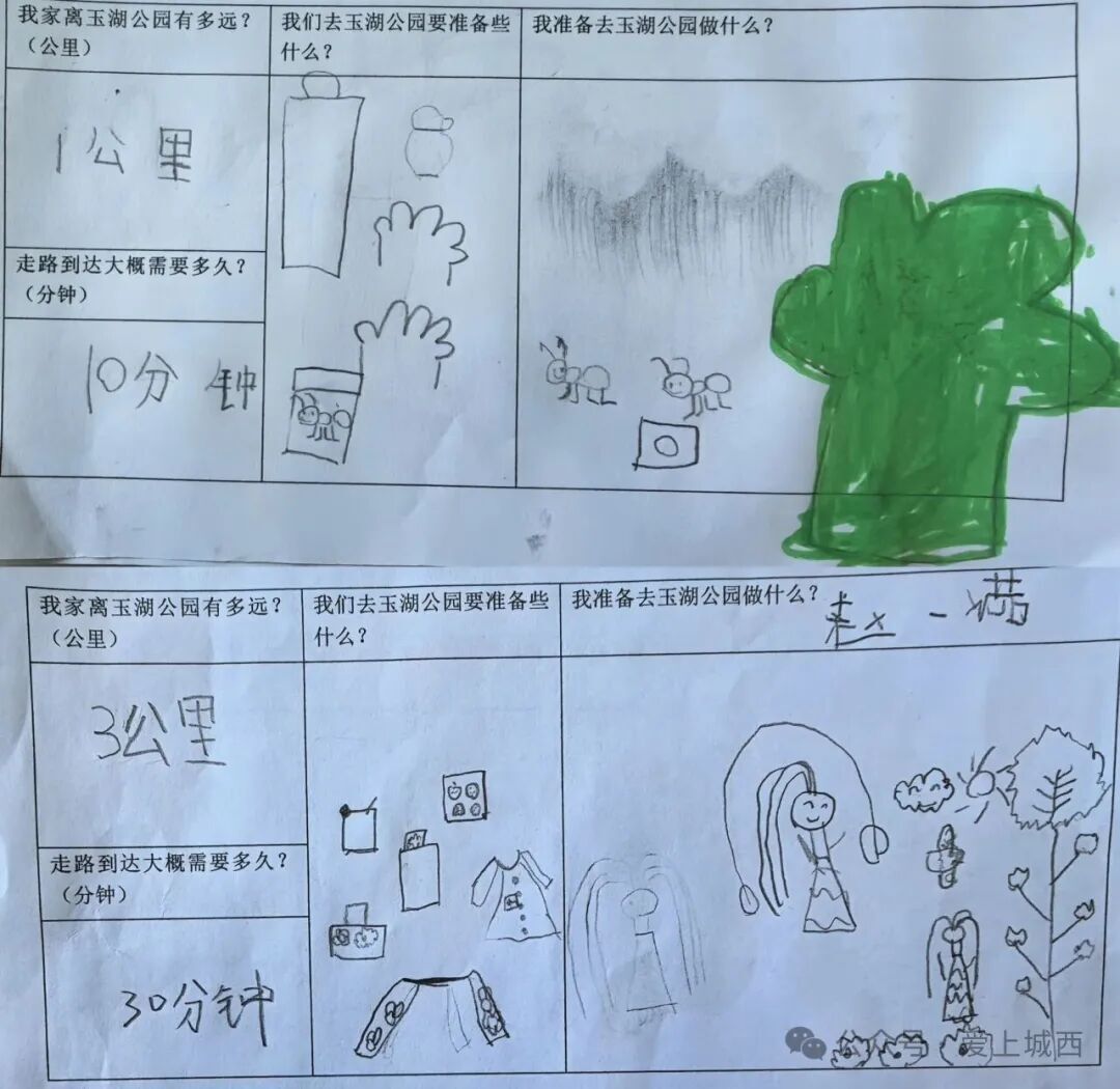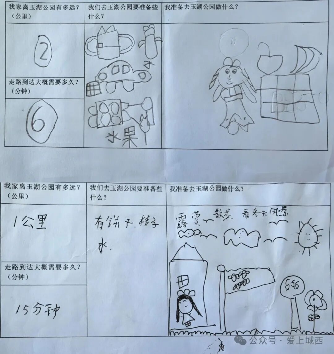 活動(dòng)前期,教師特別設(shè)計(jì)了《玉湖公園玩學(xué)活動(dòng)調(diào)查表》。調(diào)查表圍繞“家園距離與步行時(shí)間”“出行物品準(zhǔn)備”及“孩子的探索期待”三大核心問(wèn)題展開,旨在了解每個(gè)家庭與公園的空間聯(lián)系,并傾聽孩子們真實(shí)的興趣與想法。這一舉措不僅讓家長(zhǎng)與幼兒共同參與活動(dòng)籌備中,更使教師精準(zhǔn)把握了孩子們的實(shí)際需求?;谡{(diào)查反饋,教師們得以從兒童的視角出發(fā),對(duì)玉湖公園的自然資源進(jìn)行更有針對(duì)性的教育化梳理與設(shè)計(jì)確保此次活動(dòng)真正成為一次呼應(yīng)兒童興趣、鏈接家園社會(huì)的探索之旅。