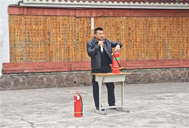 疏散集結(jié)完成后,學(xué)校分管安全工作的副校長滕樹文在現(xiàn)場對本次演練進(jìn)行了點評,并面向全體師生作了關(guān)鍵知識講解。滕校長深入闡述了消防安全的重要性,強調(diào)“安全無小事,防患于未然”,指出掌握消防知識是保護(hù)生命財產(chǎn)、維護(hù)校園穩(wěn)定的必備技能。他重點講解并演示了干粉滅火器的正確使用方法,通過“提、拔、握、壓”四個步驟的清晰拆解與現(xiàn)場示范,使師生們直觀掌握了“看、搖、拔、噴”的操作要領(lǐng)。部分師生代表還在安全指導(dǎo)下進(jìn)行了滅火器實操體驗,將理論知識轉(zhuǎn)化為實際動手能力。