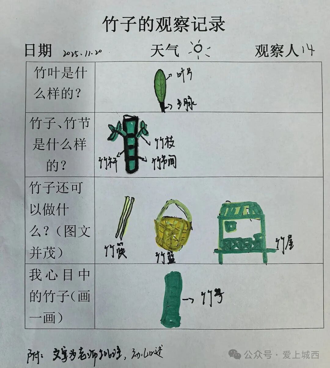 竹林探秘意猶未盡,老師們把竹子與竹葉從田野間帶回幼兒園,讓自然的氣息在教室繼續(xù)生長。孩子們圍在竹旁,觸摸竹節(jié)的紋理,細察葉脈的脈絡(luò),用眼睛記錄、用畫筆表達。師幼一起完成了對竹子的觀察記錄和調(diào)查,讓每一次發(fā)現(xiàn)都被認真珍藏。這不僅是一次探索的延續(xù),更是園內(nèi)外竹林的溫柔串通,讓村社的自然之美與課堂的成長之力緊緊相連。