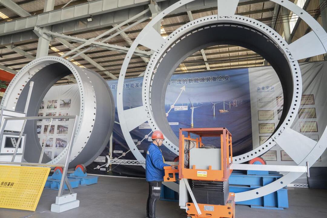 工人操作智能檢測裝備對風(fēng)電機組大型部件平面度進行檢測。(李健 攝)