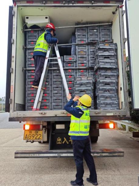 按照“雙人查驗、多點拍照”的規(guī)定,收費員童俐和班長喻東一同進行查驗。車門打開,里面整齊碼放著裝滿芒果的黑色貨箱。司機指著貨箱說:“全是芒果,快點檢查咯。”喻東卻并未大意,他轉(zhuǎn)身搬來扶梯,攀上車廂邊緣,借助強光手電筒沿著貨箱縫隙查看,并提出需要搬移部分上方貨箱對內(nèi)部進一步檢查。