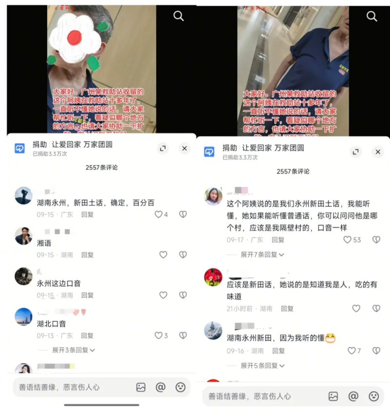 沒過多久,群里就有老鄉(xiāng)回復(fù):“聽著像湖南永州新田某個鄉(xiāng)鎮(zhèn)的口音,特別是她說‘想回家’的那個調(diào)子,很像我們那兒的話?!薄皯?zhàn)斗”一下子來了精神,他把老鄉(xiāng)的判斷反饋到了群里。