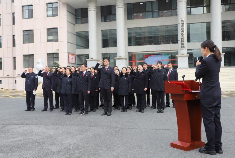 上午9時30分,全院干警整齊列隊,在辦公樓前舉行莊嚴的升國旗暨憲法宣誓儀式。伴隨著昂揚的國歌聲,鮮艷的五星紅旗在全體干警肅穆的注目禮中冉冉升起。