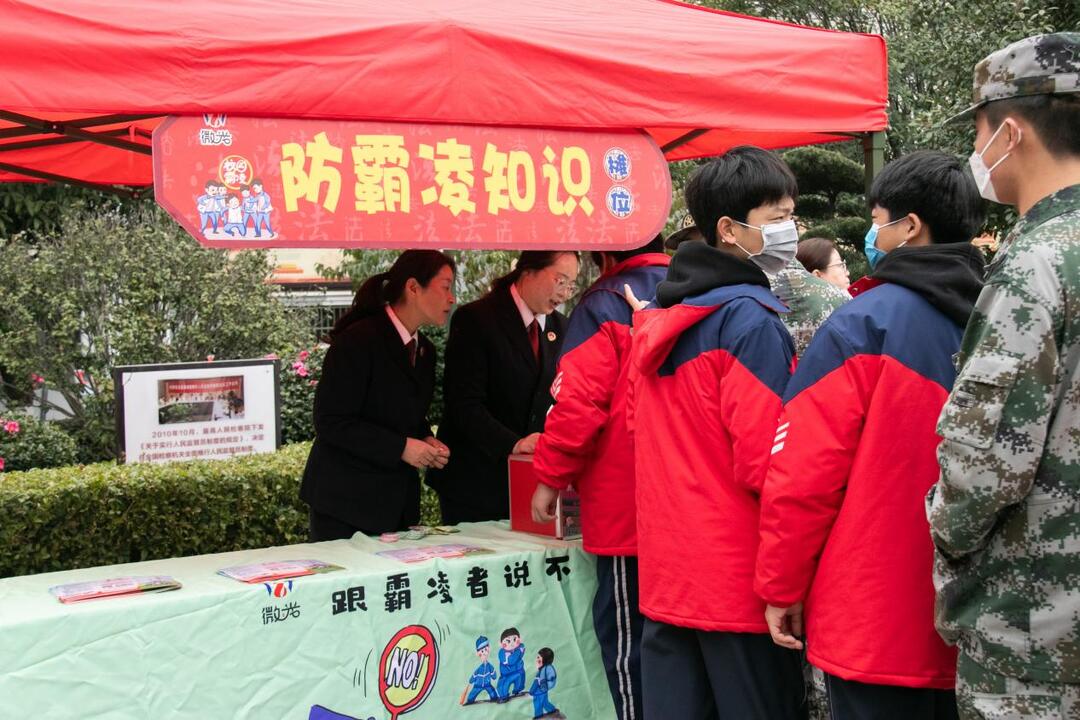 儀式過后,廣場(chǎng)已悄然變身“法治集市”。憲法知識(shí)、未成年人保護(hù)法、防校園霸凌、防性侵自我保護(hù)、家庭教育、預(yù)防犯罪,6個(gè)主題鮮明的“學(xué)法攤位”構(gòu)成一道亮麗的風(fēng)景線。展板上案例鮮活,檢察人員講解耐心,同學(xué)們手持法律手冊(cè),一邊翻看學(xué)習(xí),一邊穿梭于各個(gè)攤位之間:“校園欺凌的主要形式有哪些?”“遭遇網(wǎng)絡(luò)暴力該怎么辦?”……現(xiàn)場(chǎng)問答聲、討論聲、歡笑聲此起彼伏。學(xué)法答題、套圈得物,這不僅是游戲,更是潤(rùn)物無聲的法治啟蒙。