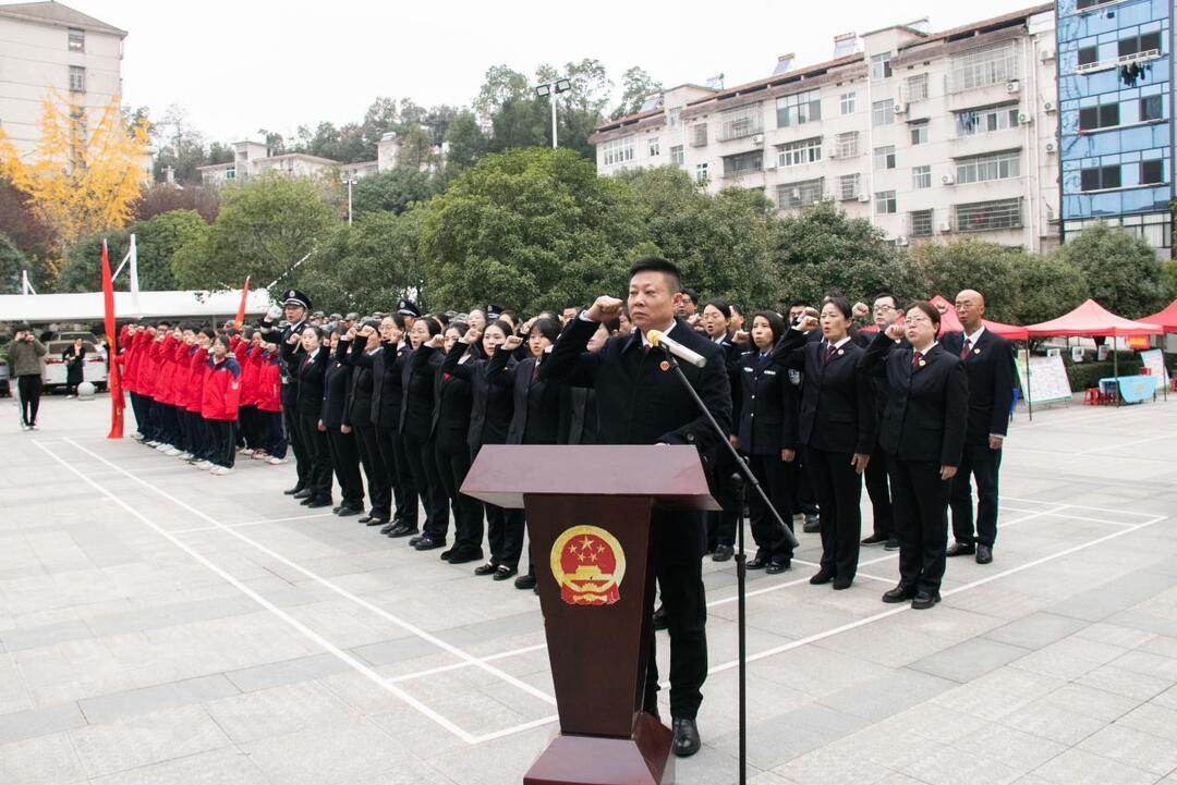 清晨八點(diǎn)半,升旗儀式在微光法治廣場(chǎng)正式開始,伴隨著莊嚴(yán)的國(guó)歌,五星紅旗冉冉升起。全體檢察人員與參加活動(dòng)師生的目光共同追隨著那抹鮮紅升至頂端——這一刻,國(guó)家意識(shí)與法治信仰在無聲中交融。禮畢,全體人員面向憲法,右手舉拳:“我宣誓:忠于《中華人民共和國(guó)憲法》,維護(hù)憲法權(quán)威……”誓言鏗鏘回蕩,也深深印入在場(chǎng)每一位青少年的心中。