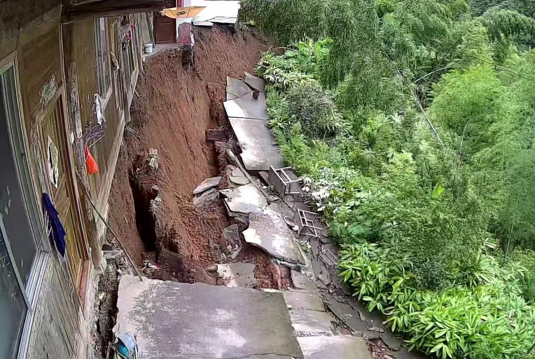 當(dāng)日下午,雨勢(shì)漸猛,關(guān)口溪村桂竹園組組長(zhǎng)照常開(kāi)展雨中巡察。行至謝明滿(mǎn)家屋前時(shí),他腳步一頓——地面竟出現(xiàn)一些細(xì)小裂縫,蜿蜒狹窄的裂縫透著不尋常的危險(xiǎn)信號(hào)。“這雨下得又大有急,這縫只怕是經(jīng)不起久沖!”多年防汛經(jīng)驗(yàn)讓他心頭一緊,馬上沿著房屋周?chē)屑?xì)勘察,拍下周?chē)牧芽p照片后他當(dāng)即撥通村支部電話匯報(bào)。