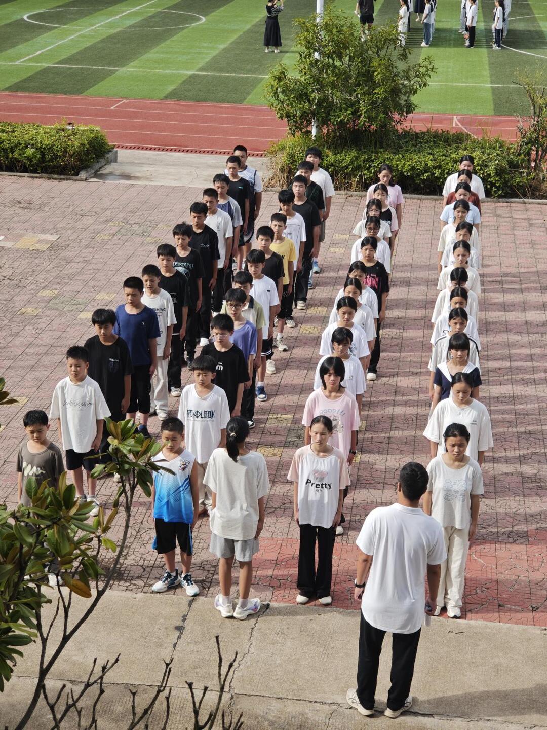 這三天,“抬頭、挺胸、收腹!”教官洪亮的口號(hào)響徹在校園各個(gè)角落,教官們認(rèn)真地指導(dǎo)同學(xué)們軍姿要領(lǐng),堅(jiān)定的眼神里透露出對(duì)孩子們的負(fù)責(zé)。站軍姿時(shí),豆大的汗珠滾落臉頰,無(wú)人擦拭;練敬禮時(shí),如軍人般挺拔身姿,傳遞敬意;走齊步時(shí),頂著烈日反復(fù)練習(xí),仍然堅(jiān)持。班主任和各科任老師們也陪伴著這群孩子們,看著他們從“不整齊”到“默契配合”的隊(duì)列,從做事拖拉到行動(dòng)迅速的轉(zhuǎn)變,肉眼可見(jiàn)的成長(zhǎng),讓老師們對(duì)孩子們豎起了大拇指。