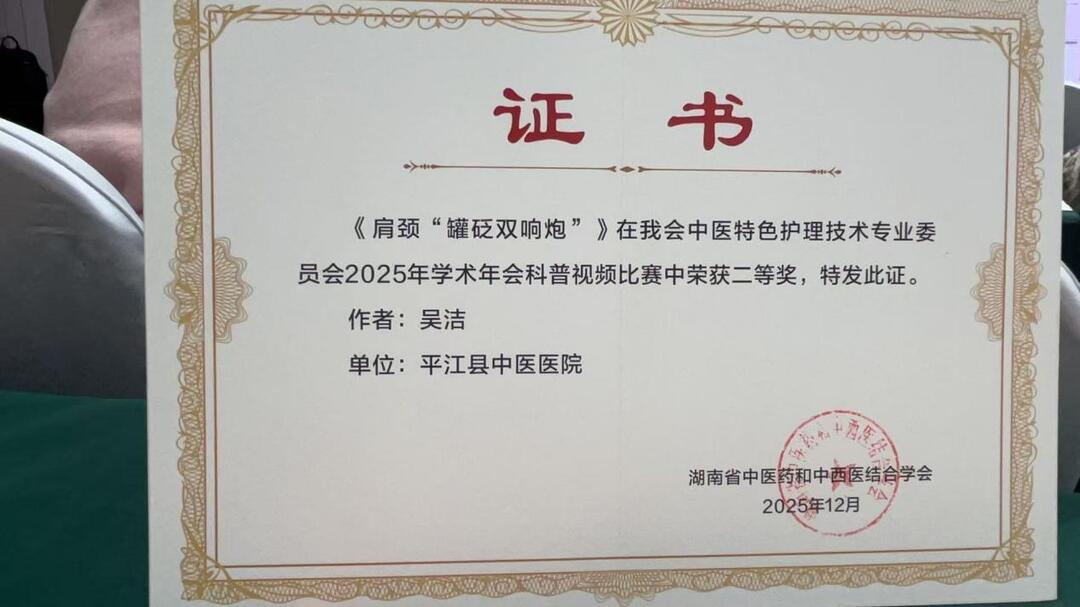 近日,在湖南省中醫(yī)藥和中西醫(yī)結(jié)合學(xué)會學(xué)術(shù)會期間,由中醫(yī)特色護(hù)理技術(shù)專業(yè)委員會2025年學(xué)術(shù)年會主辦的“中醫(yī)特色護(hù)理技術(shù)”科普視頻比賽中,平江縣中醫(yī)醫(yī)院黨建辦與中醫(yī)藥特色保健門診共同創(chuàng)作的原創(chuàng)科普視頻《肩頸“罐砭雙響炮”》在比賽中表現(xiàn)亮眼,榮獲全省二等獎。